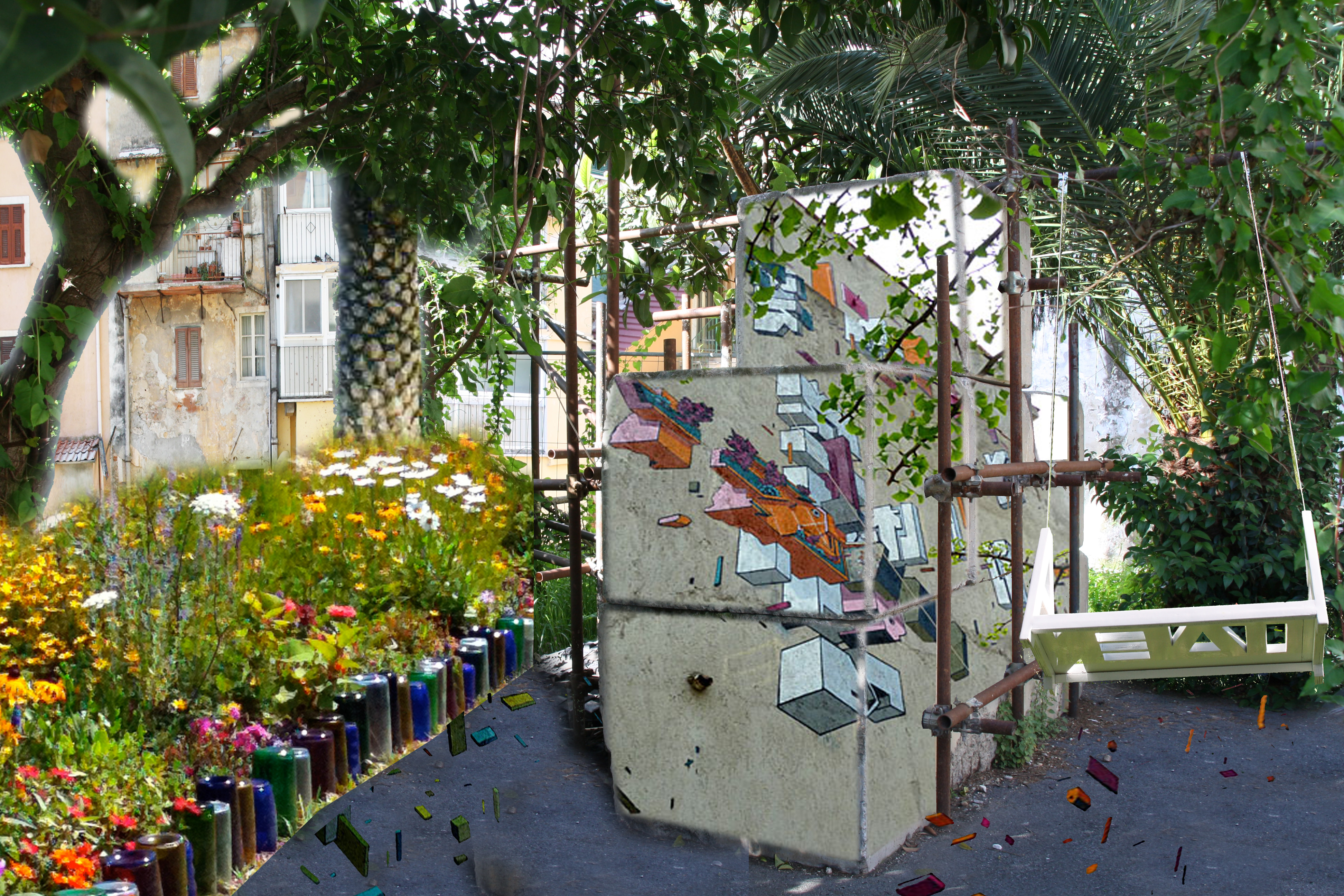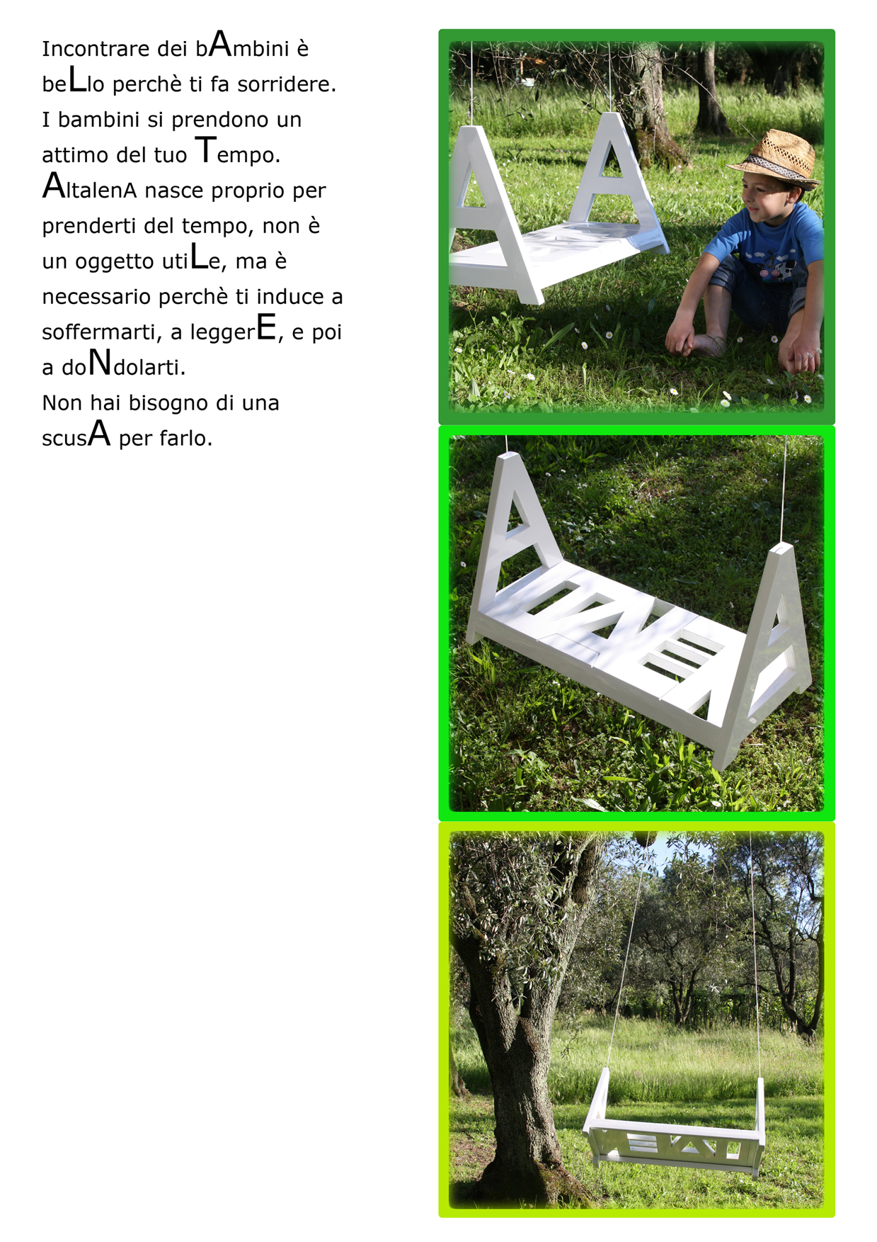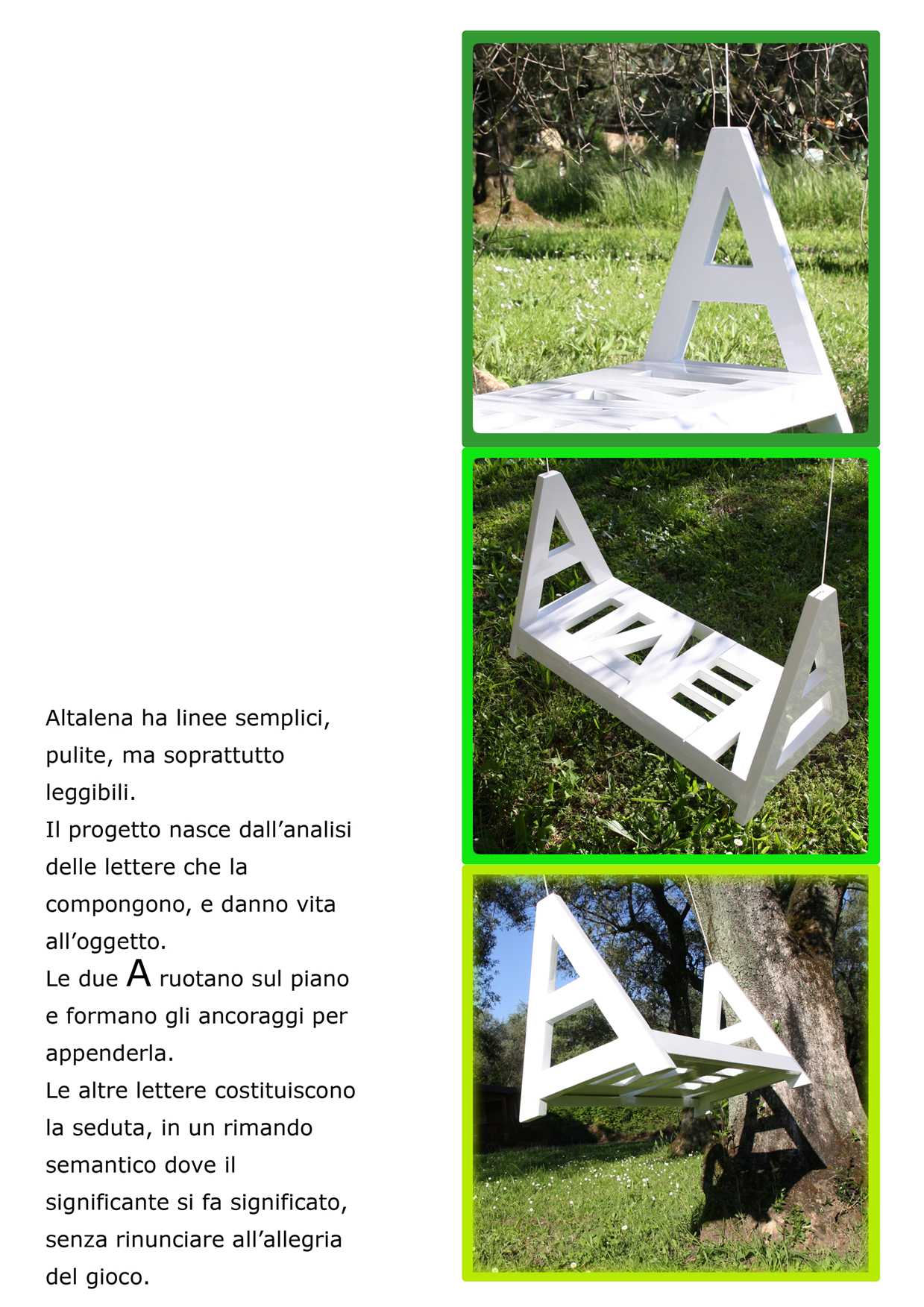 Dall’idea iniziale di esporre un’ altalena, ci confrontiamo e si sviluppa un progetto sociale di riqualificazione urbana: il progetto Altalena ha come fine quello di sensibilizzare adulti e bambini per la riacquisizione di spazi verdi dimenticati.