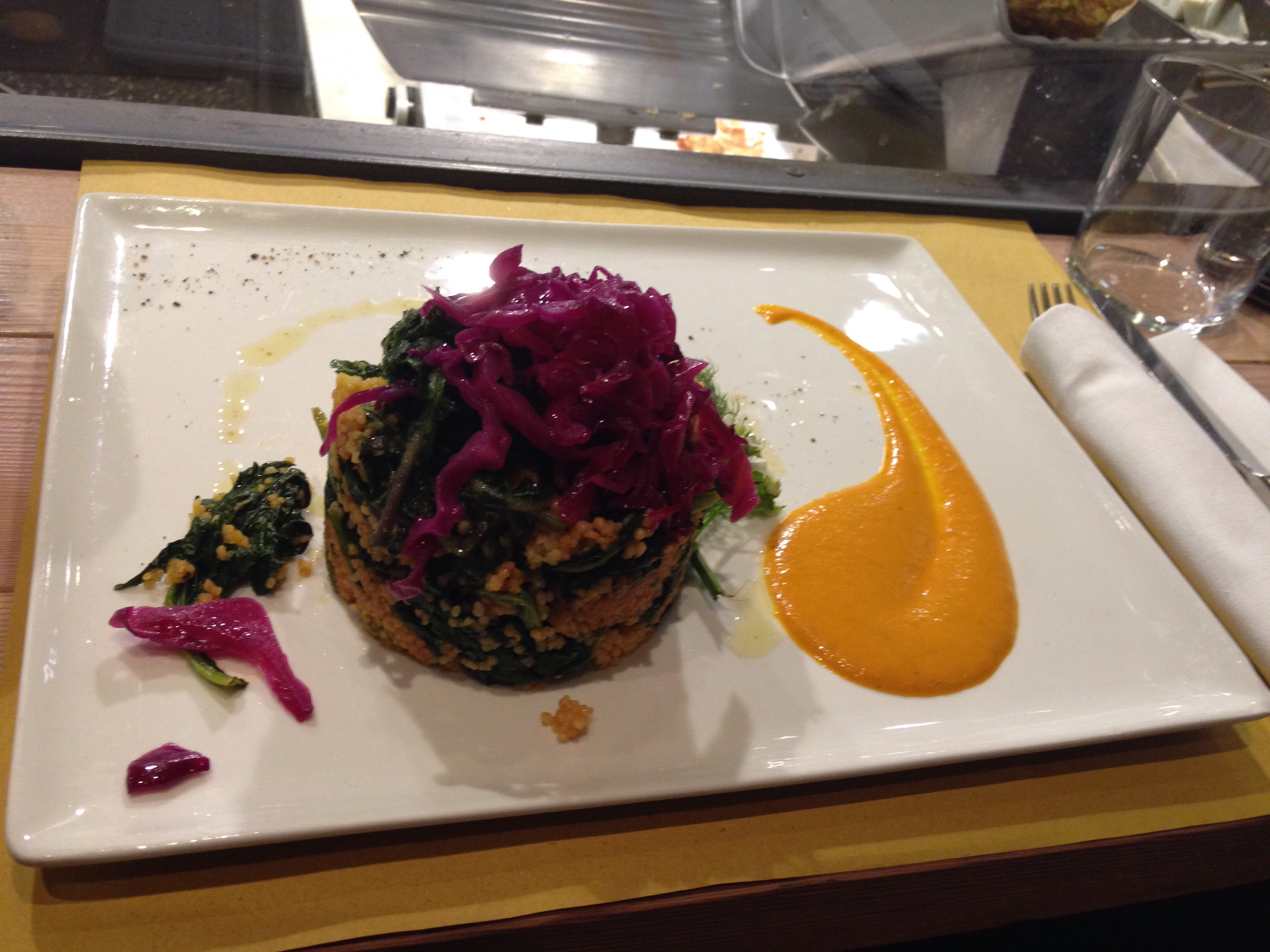 Cous cous con cime di rapa, uva passa al moscato e salsa di peperoni