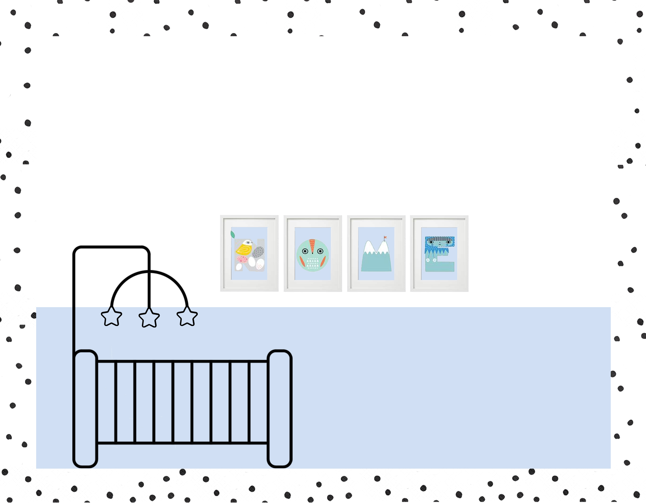 Nel KiT troverai tutto quello che ti serve per la personalizzazione della parete: una latta di colore cod. Azzurro Baby, le stampe delle lettere del nome con cornice, chiodi e nastro adesivo.